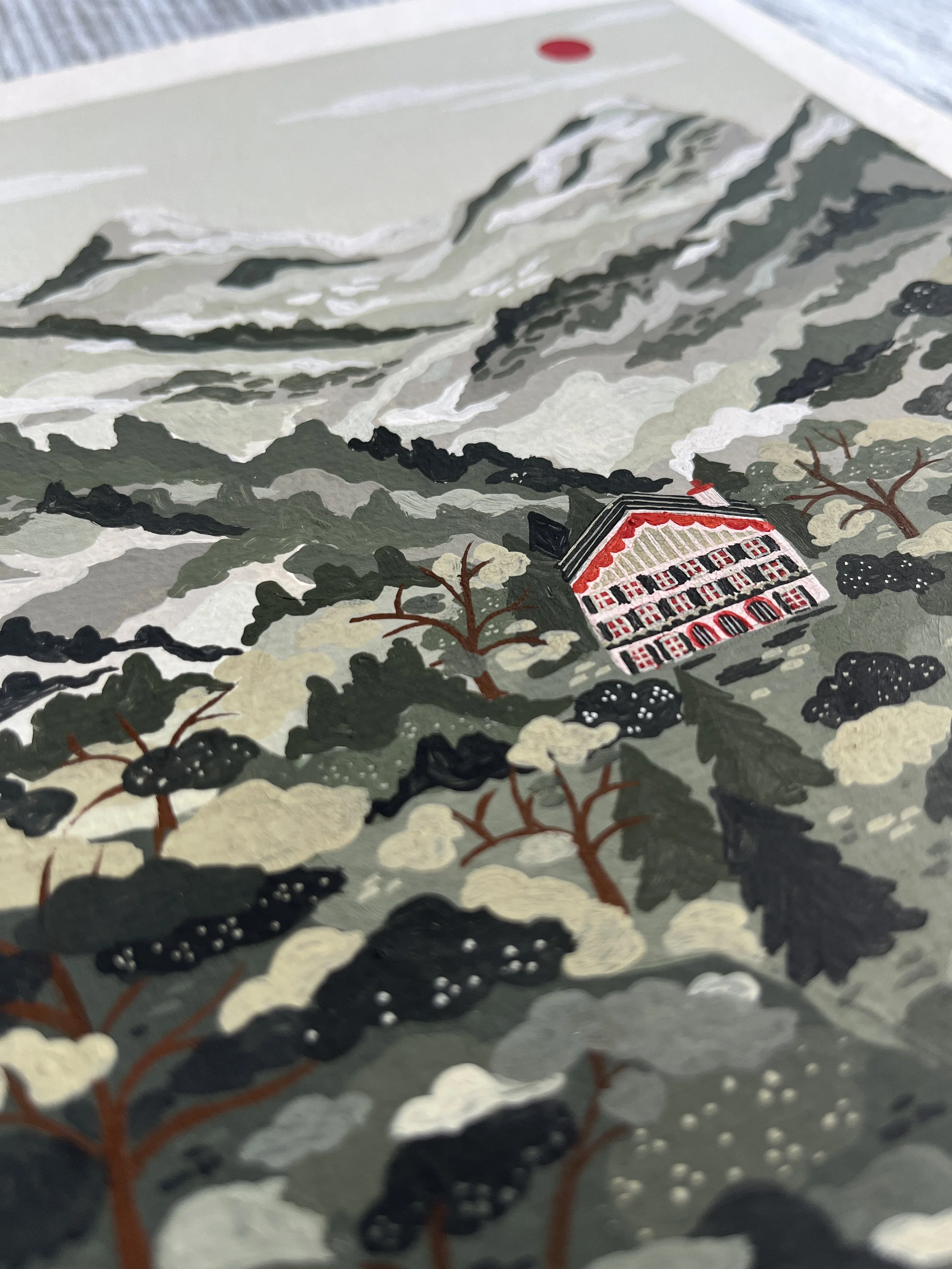 Peinte d’après le souvenir nostalgique d’une randonnée au cœur du parc des Écrins, guidée par une seule idée : atteindre ce refuge lointain, perché entre les montagnes. J’ai réinterprété cette maison isolée, blottie au milieu des sommets encore enneigés, comme je l’ai vue ce bel après-midi de printemps. Par la suite, toujours dans mon envie d’explorer l’animation, j’ai réalisée une vidéo afin de donner un peu de vie à ce paysage montagnard.